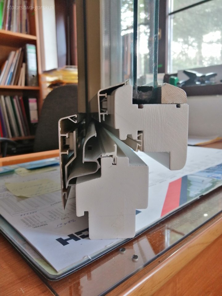 drewno klejone trójwarstwowo; sosna, meranti tworzą jednoramową konstrukcję okna o profilu EURO-DJ-68 SOFTLINE