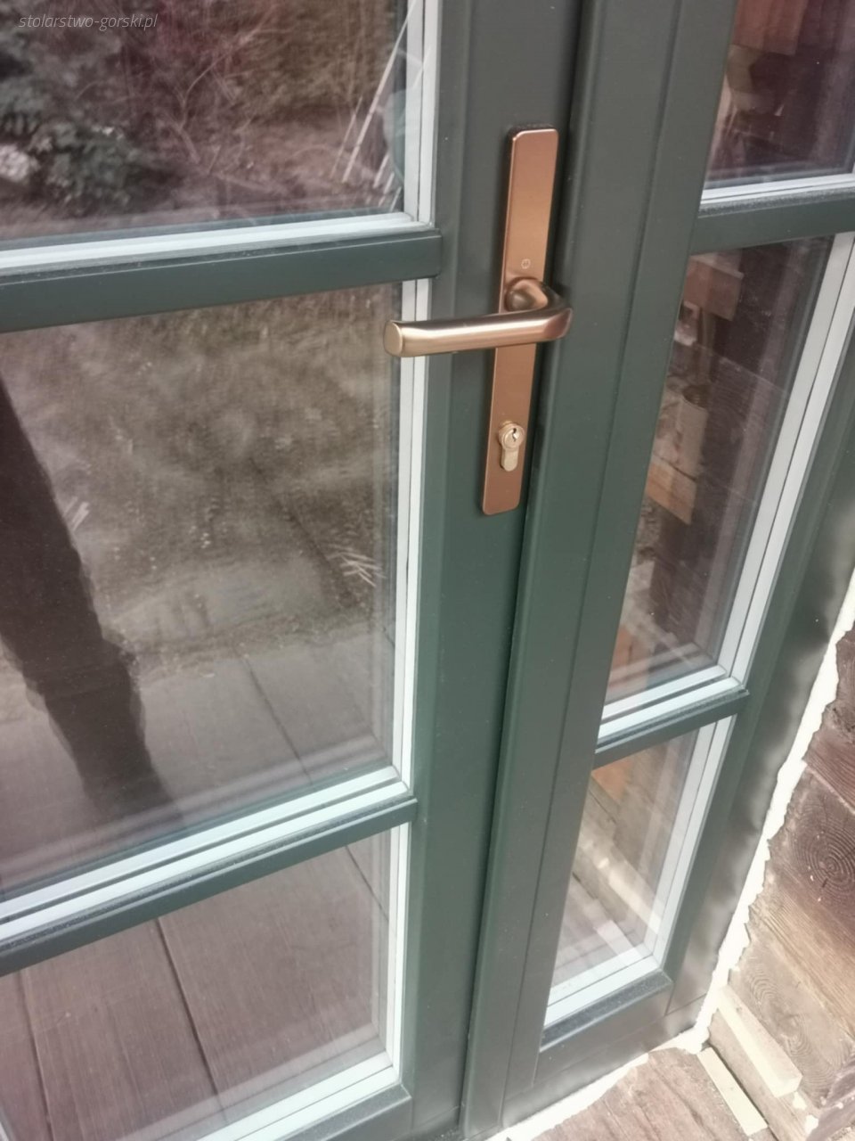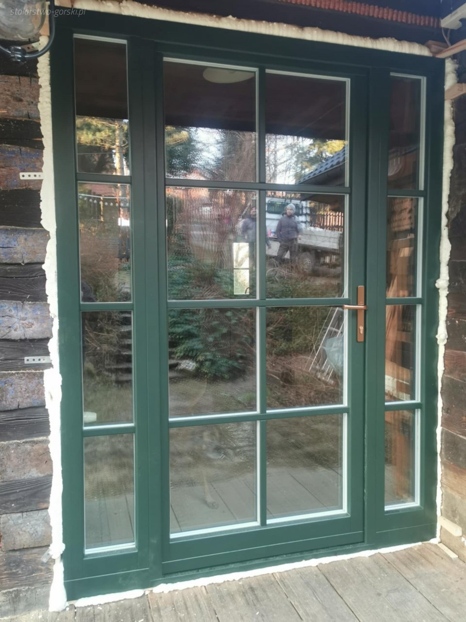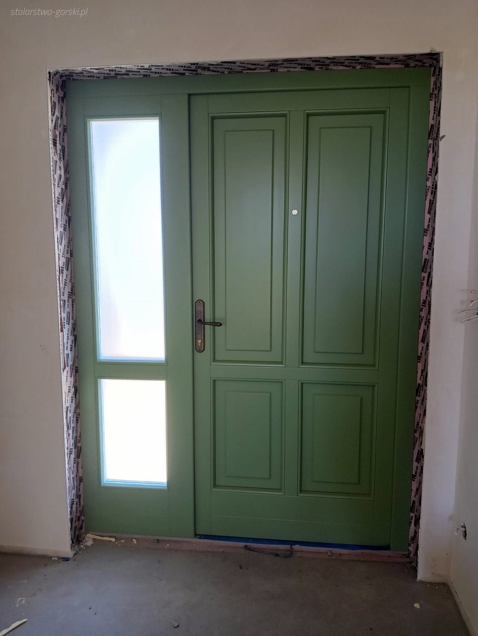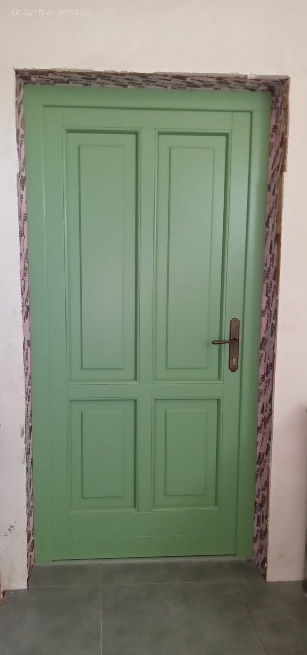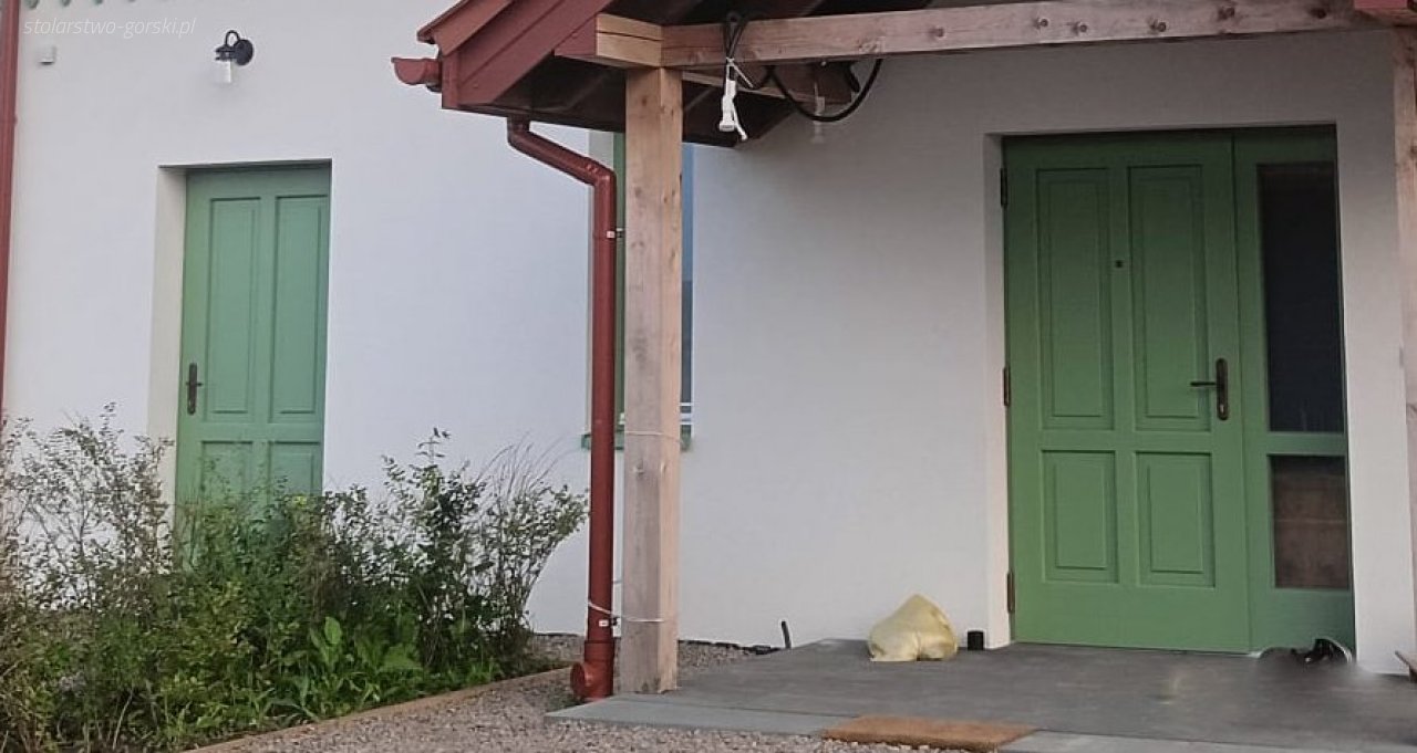 Drzwi zewnętrzne drewno sosnowe, meranti klejone warstwowo, wykańczane elastycznym lakierem niemieckiej firmy Remmers.