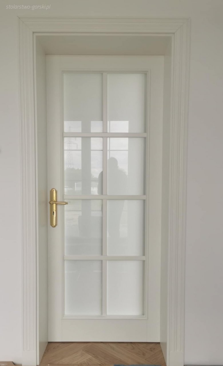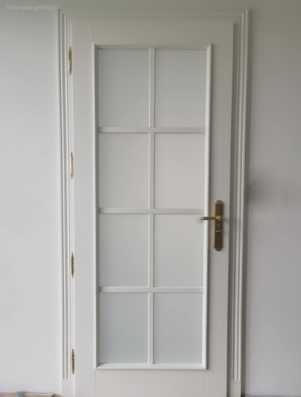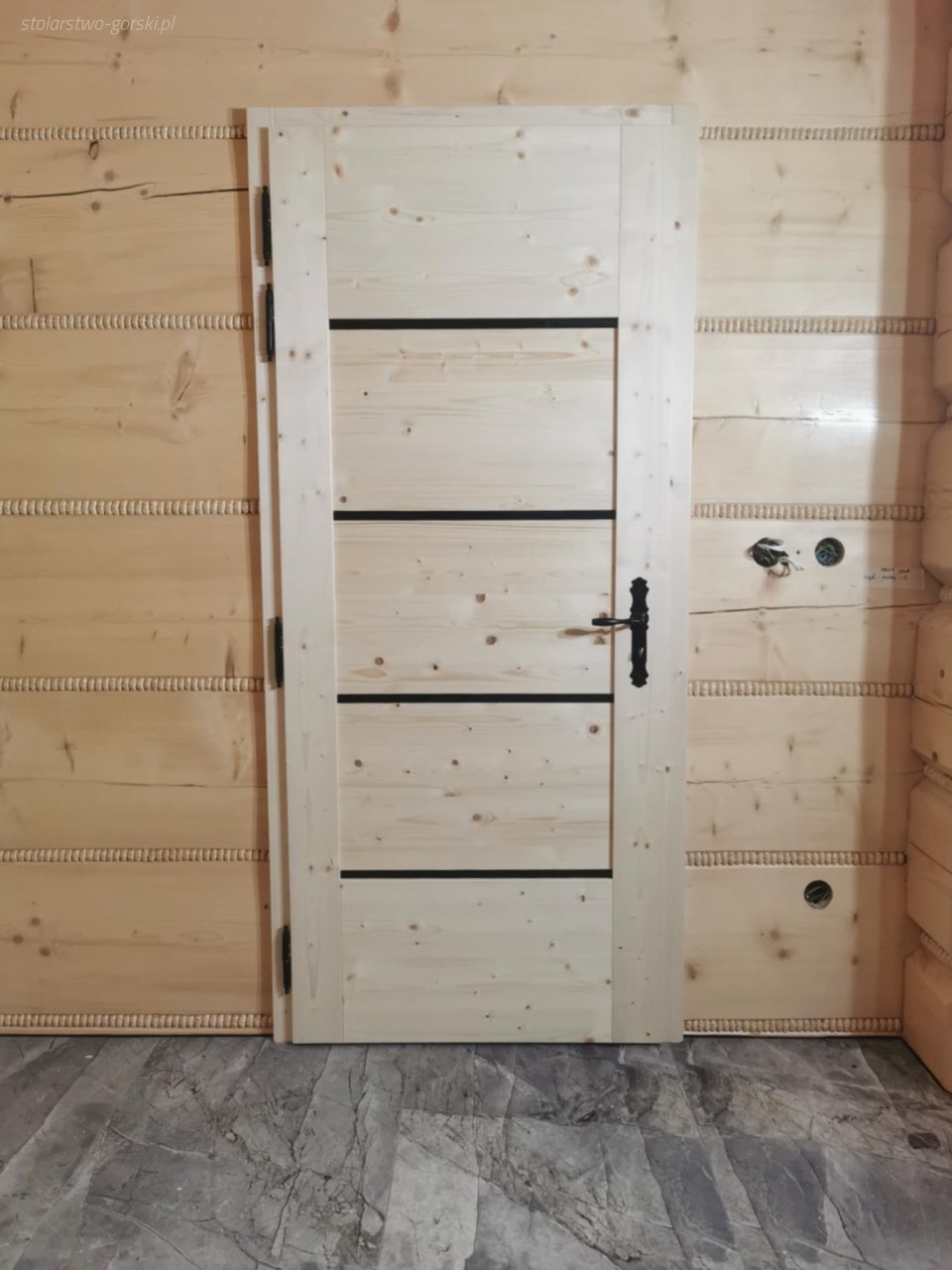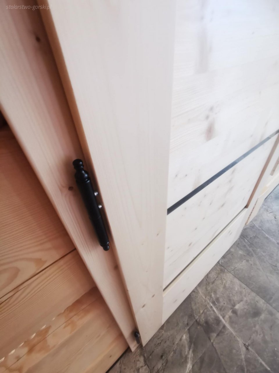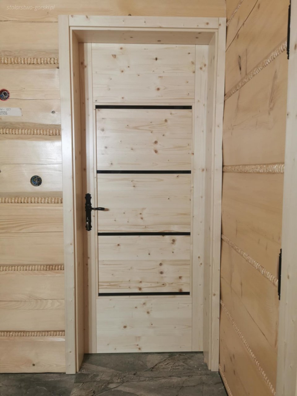 Drzwi wewnętrzne sosnowe klejone warstwowo, fornirowane 4 mm obłogiem, wykańczane utwardzanym lakierem niemieckiej firmy Remmers.