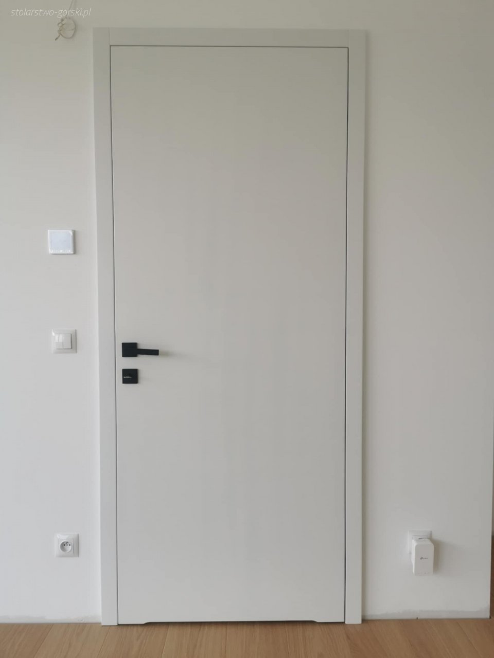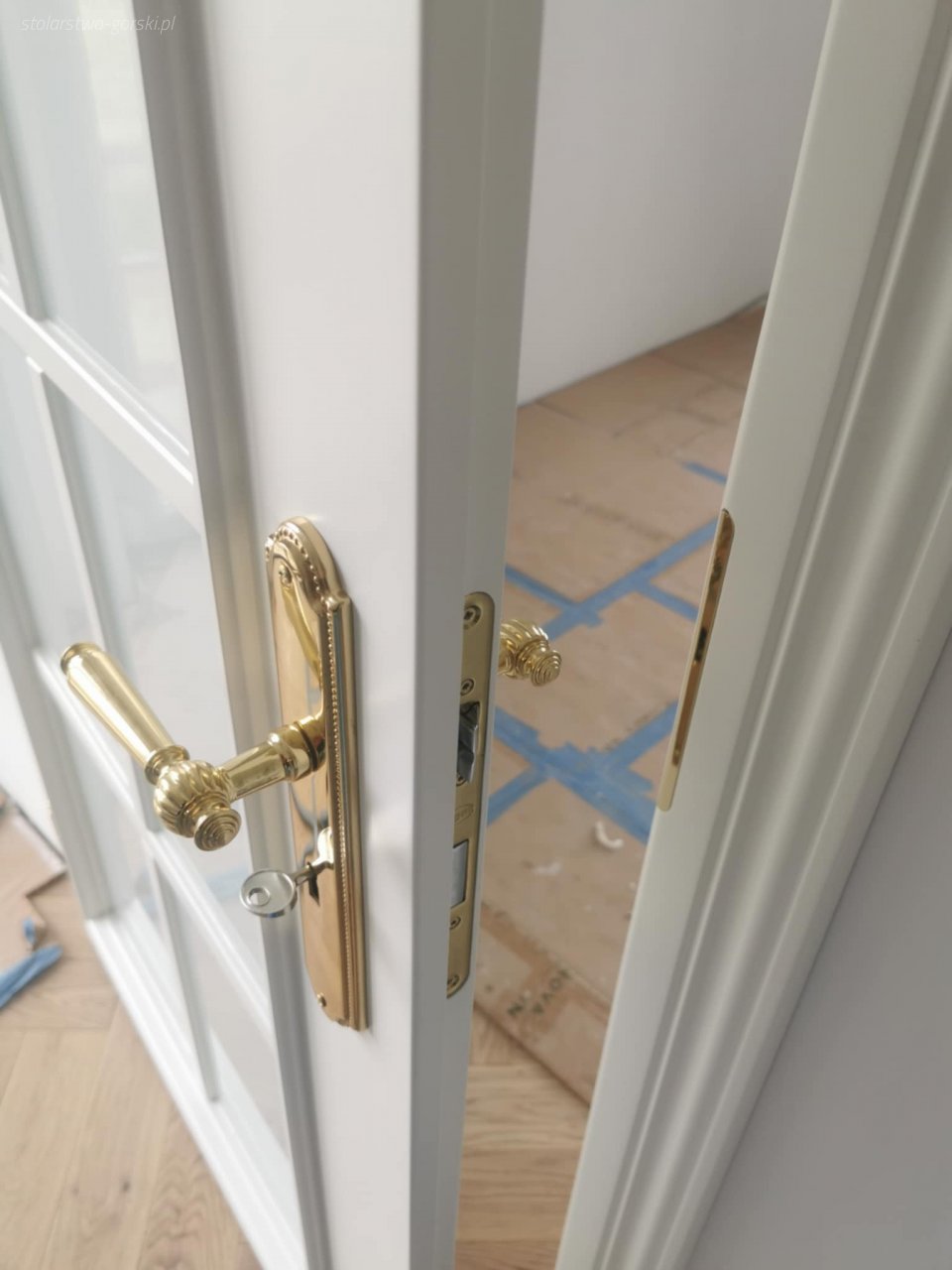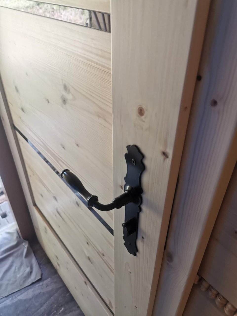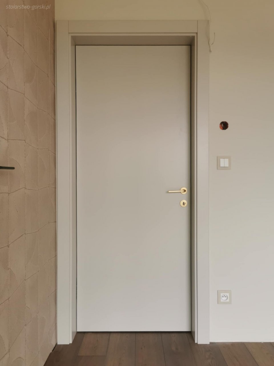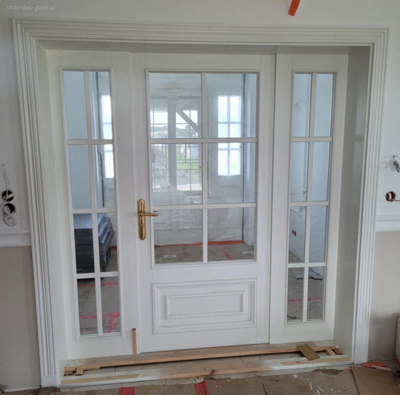 Drzwi wewnętrzne sosnowe klejone warstwowo, fornirowane 4 mm obłogiem, wykańczane utwardzanym lakierem niemieckiej firmy Remmers.